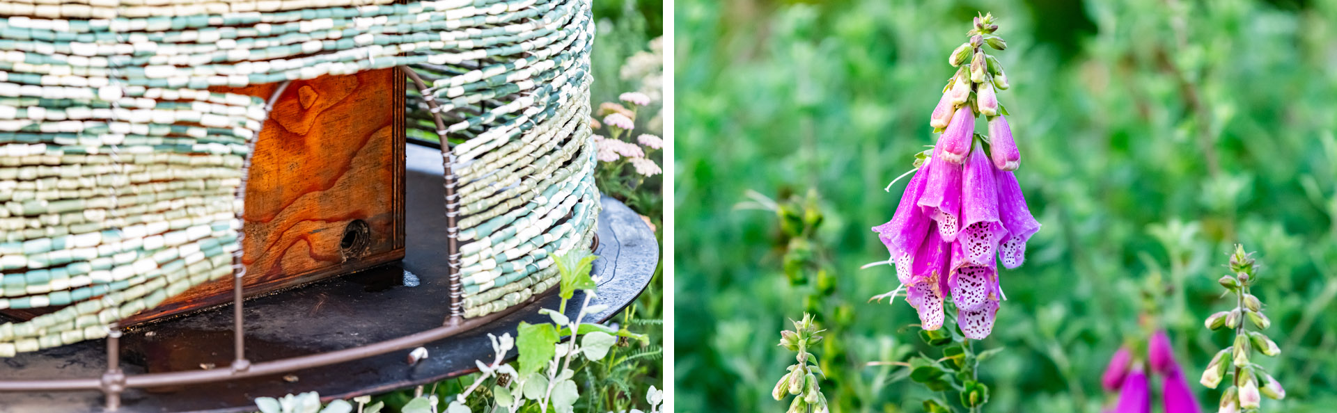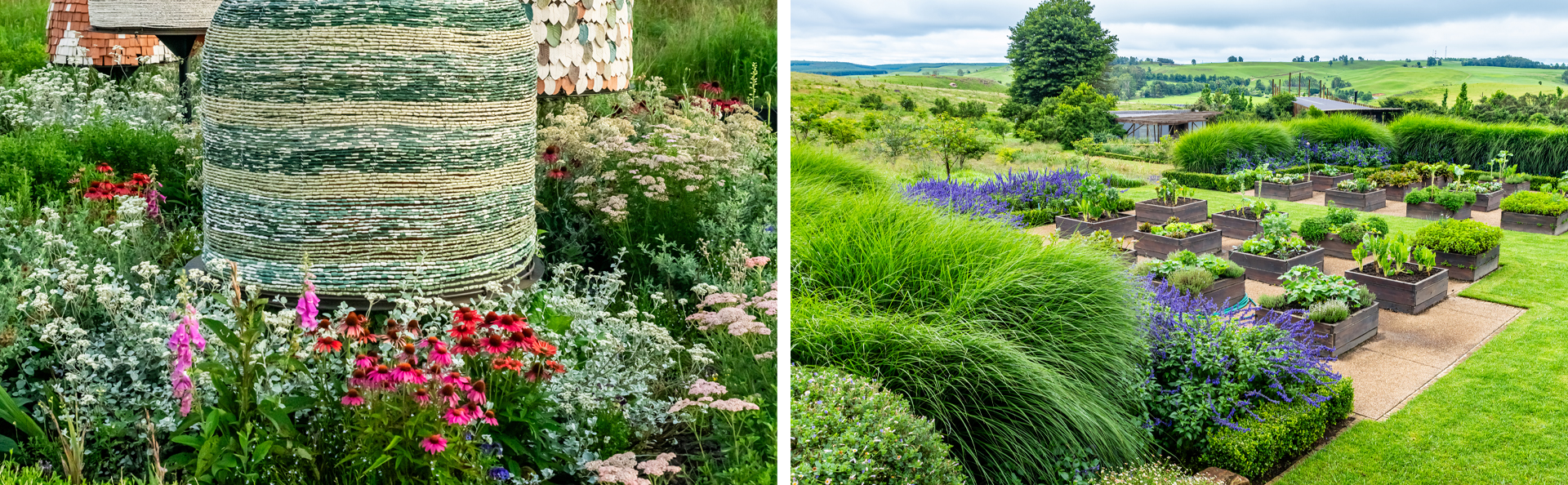 At the heart of the garden lies the Bee Kraal—a living art installation encircled by cherry trees.In spring it hums with energy as thousands of honeybees forage among foxgloves, lavender, rosemary, echinacea, and Mexican fleabane. The air vibrates withlife, reminding us that these tireless pollinators sustain not only our gardens but ecosystems far beyond. Their honey, golden and organic, finds its way into the kitchens, connecting nature’s rhythm to the dining table.